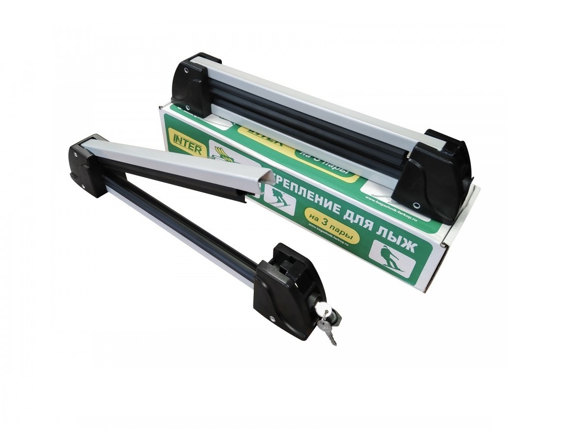 Крепление для перевозки лыж и сноубордов на поперечинах. Каркас стальной, окрашен серебристой краской. Замыкается на металлический замок. Для 3-х пар лыж.